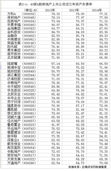 抽样调查我国房地产上市公司排名前100名的公司A股上市的40家公司,从表2-1中数据可以得出:从2012年到2014年,40家房地产上市公司资产负债率普遍在70%左右,且居高不下。对于一般公司而言,资产负债率在40%-60%是合理的,这样不会有过分的偿债压力。因此,偏高的资产负债率表明了我国房地产上市公司财务风险相对较高,可能带来现金流不足使,资金链断裂,不能及时偿债,从而导致公司破产的情况。同时,资产负债率过高也会导致融资成本进一步增加。