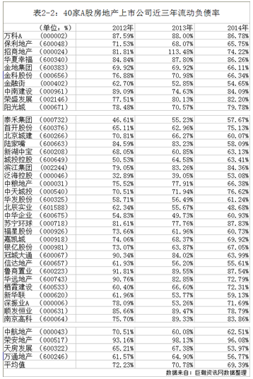 表2-2中数据显示:40家样本房地产上市公司近三年的平均流动负债率居高不下,均在70%。一般公司,流动负债率在50%左右才是合理的。大部分样本房地产上市公司的流动负债率都远远超过了50%。数据表明,我国房地产上市公司的负债结构,短期债务占比大。虽然短期债务可以减少公司的融资成本,但是由于借款期限短,加剧了公司的还款压力,提高了公司的财务风险。同时,过多的短期债务会增加再融资的压力。如果国家经济大萧条,公司的经营风险会加大,很容易面临破产的危机。