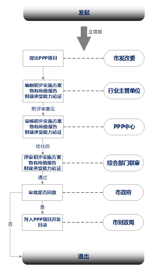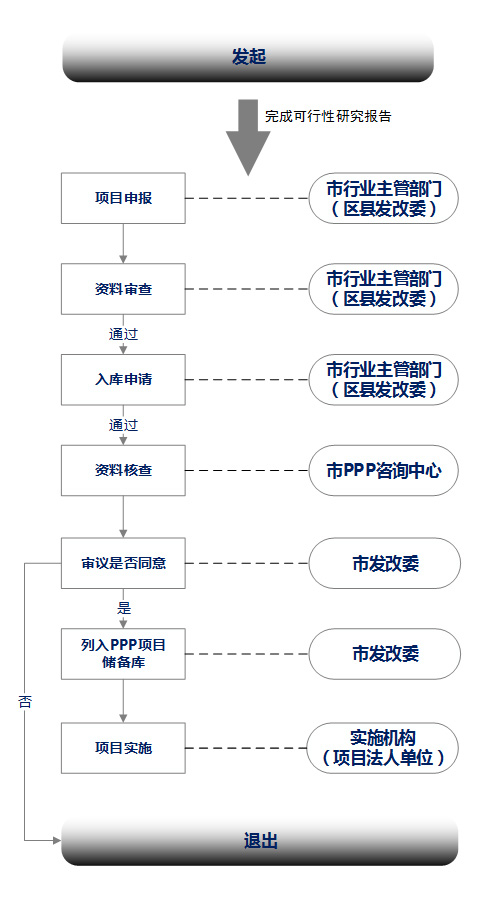 1.项目发起时,一般由政府或者社会资本方提出。项目完成可行性研究报告后,市政府行业主管部门和区县(自治县)发改委梳理符合PPP合作要求的项目。