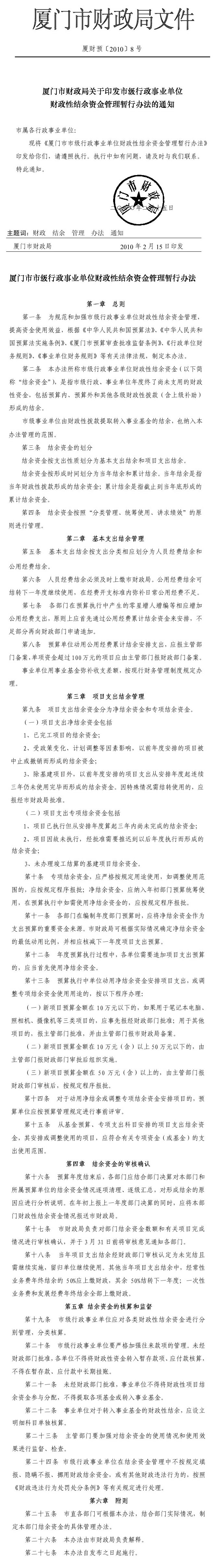 (厦财预[2010]8号)365bet体育在线下载关于印发市级行政事业单位财政性结余资金管理暂行办法的通知