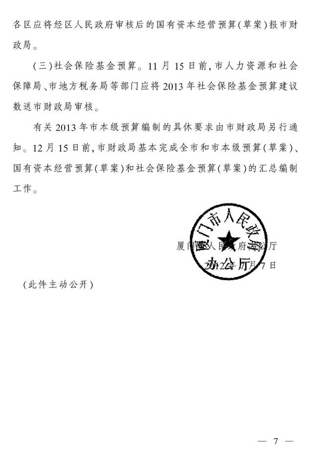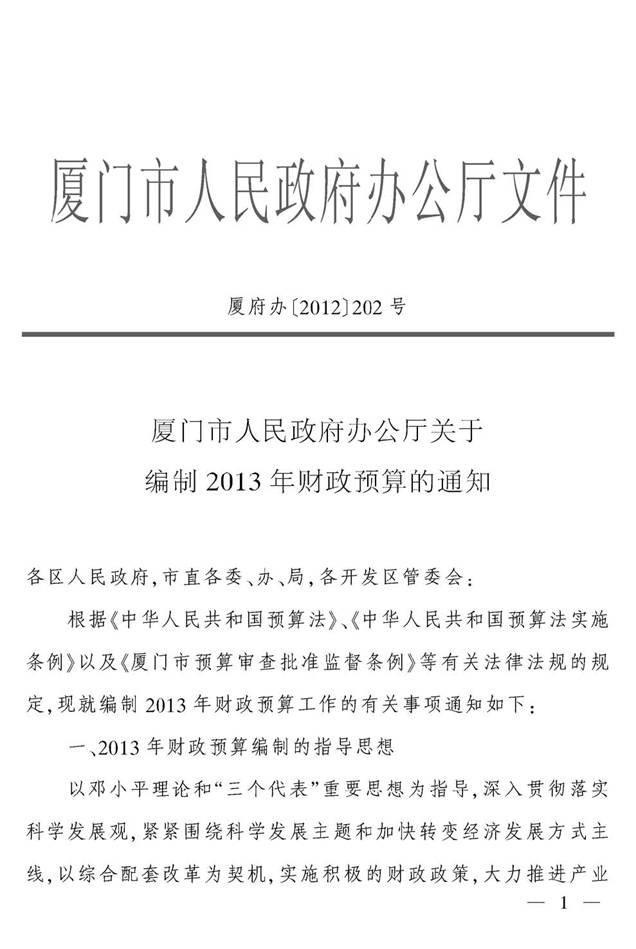 (厦府办[2012]202号)厦门市人民政府办公厅关于编制2013年财政预算的通知