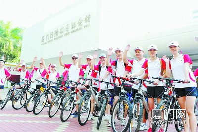 上午8时许,位于原湖里区政府办公大楼的全国第一个经济特区纪念馆——厦门经济特区纪念馆,统一穿着红白相间T恤衫的财政干部和单车爱好者整装待发。记者注意到,参加活动的以中青年财政干部为主,还有不少刚加入财政队伍不久的“85后”新人也热情地加入其中。