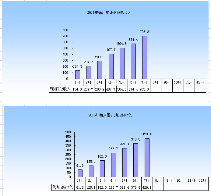 截止2016年7月,全市一般公共预算总收入累计实现703.8亿元,自然增长12.6%,为预算的65.1%。其中:地方级收入429.1亿元,自然增长14.7%,同比增长16.6%(按照新体制调整2015年收入基数),为预算的57.9%;上划中央收入274.7亿元,增长9.4%。全市一般公共预算支出364.7亿元,增长14%,完成预算的55%。
