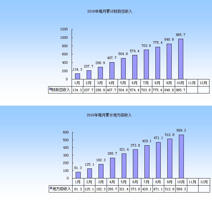 全市一般公共预算。1-10月,实现财政总收入965.7亿元,增长12.2%,为预算的89.3%,其中:地方级收入569.3亿元,自然增长10.2%,同口径增长12.1%(按照新体制调整2015年收入基数),为预算的88.2%,上划中央收入396.4亿元,增长15.3%,为预算90.9%。全市一般公共预算支出583.7亿元,增长22.1%,完成预算的83.3%,有效保障各项重点支出。