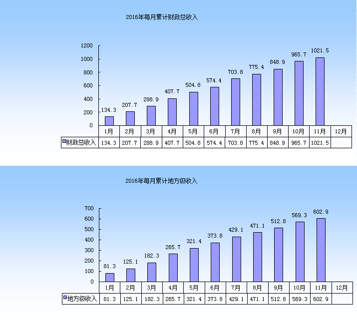截止2016年11月,全市一般公共预算总收入累计实现1021.5亿元,增长11%,为预算的94.5%,其中:地方级收入602.9亿元,自然增长8.6%,同口径增长10.6%(按照新体制调整2015年收入基数),为预算的93.4%,上划中央收入418.6亿元,增长14.6%,为预算96%。全市一般公共预算支出656.3亿元,增长24.4%,完成预算93.5%,有效保障各项重点支出。