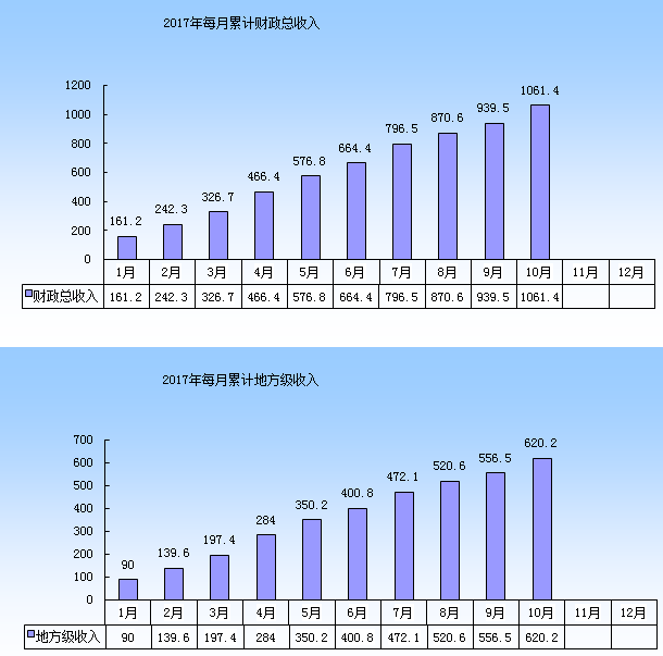 1-10月,全市一般公共预算财政总收入1061.4亿元,增收96亿元,增长10%,为预算的91.1%,其中地方级收入620.2亿元,增收71亿元,同口径增长12.9%,为预算的91.2%。分税种看,增值税、营业税和改征增值税实现319.5亿元,下降2.6%,主要是受营改增扩围行业减收影响,剔除这一因素三项流转税增长约6%;企业所得税和个人所得税实现387.6亿元,增长13.3%,占税收增量65%,主要是得益于减税降负和扶持实体措施力度加大,企业经营利润保持20%以上增长,同时居民工资薪金收入和财产转让所得增长较快;土地增值税实现82亿元,增长20.3%,主要是土增税清算收入增加。契税实现37.4亿元,增长22.3%,主要是土地出让契税收入增加。