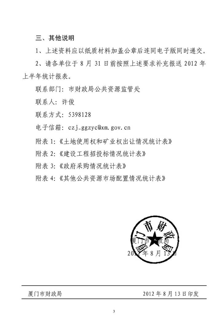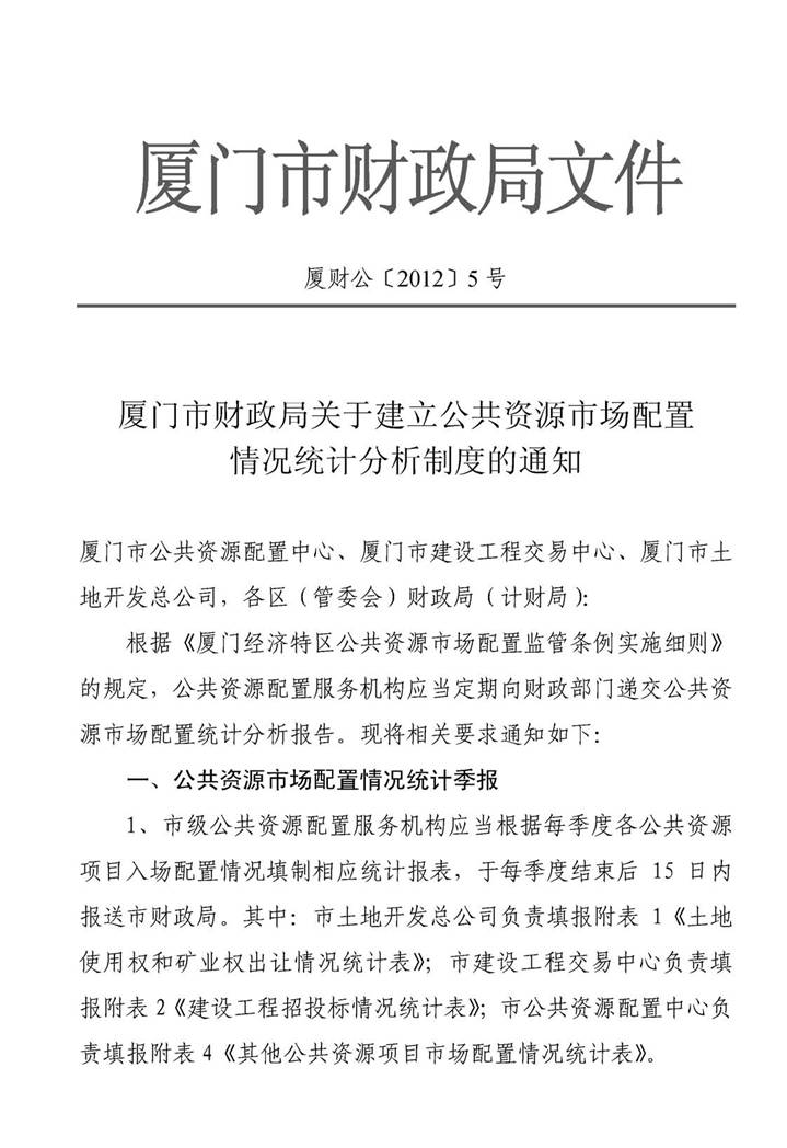 厦财公〔2012〕5号《365bet体育在线下载关于建立公共资源市场配置情况统计分析制度的通知》