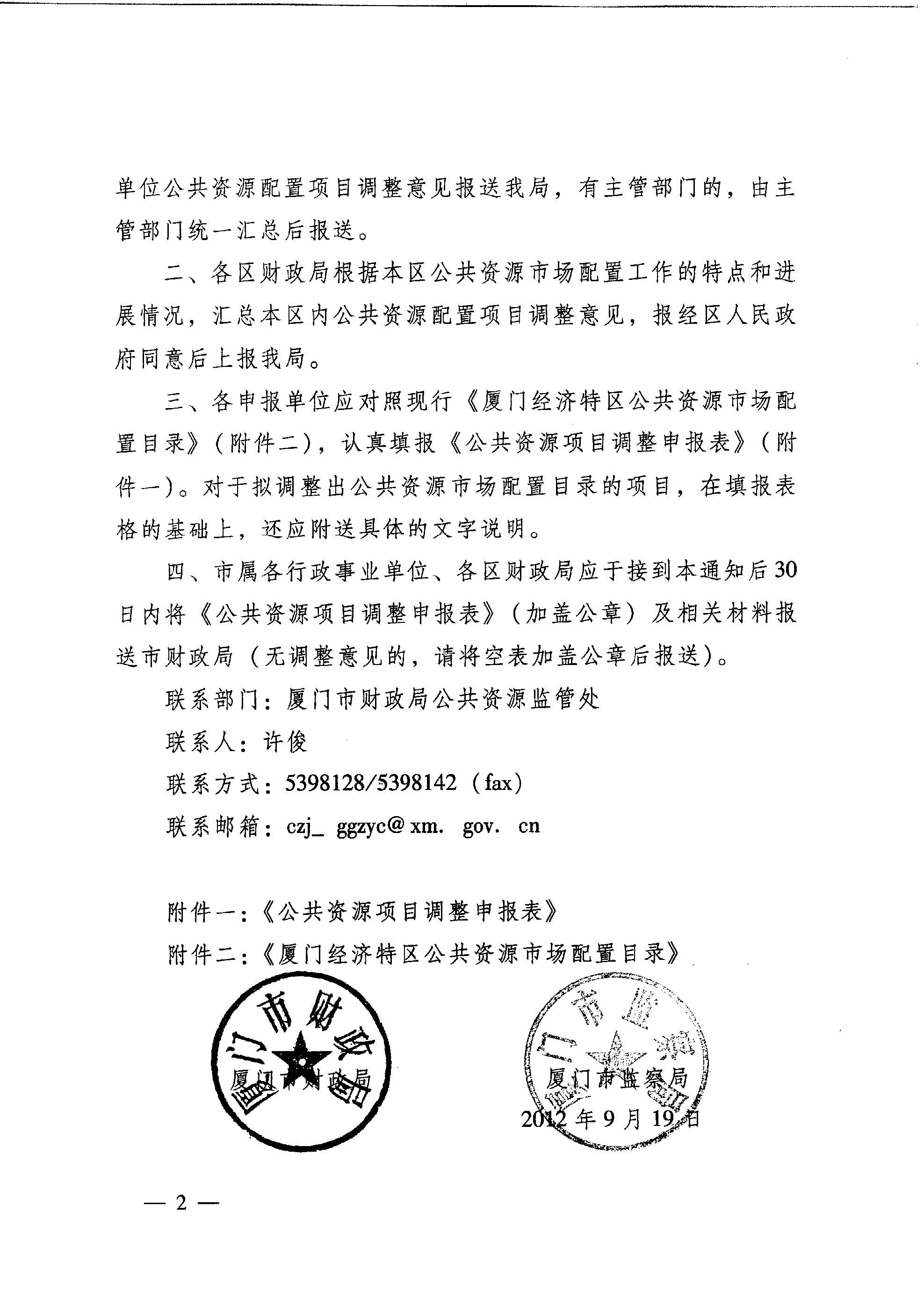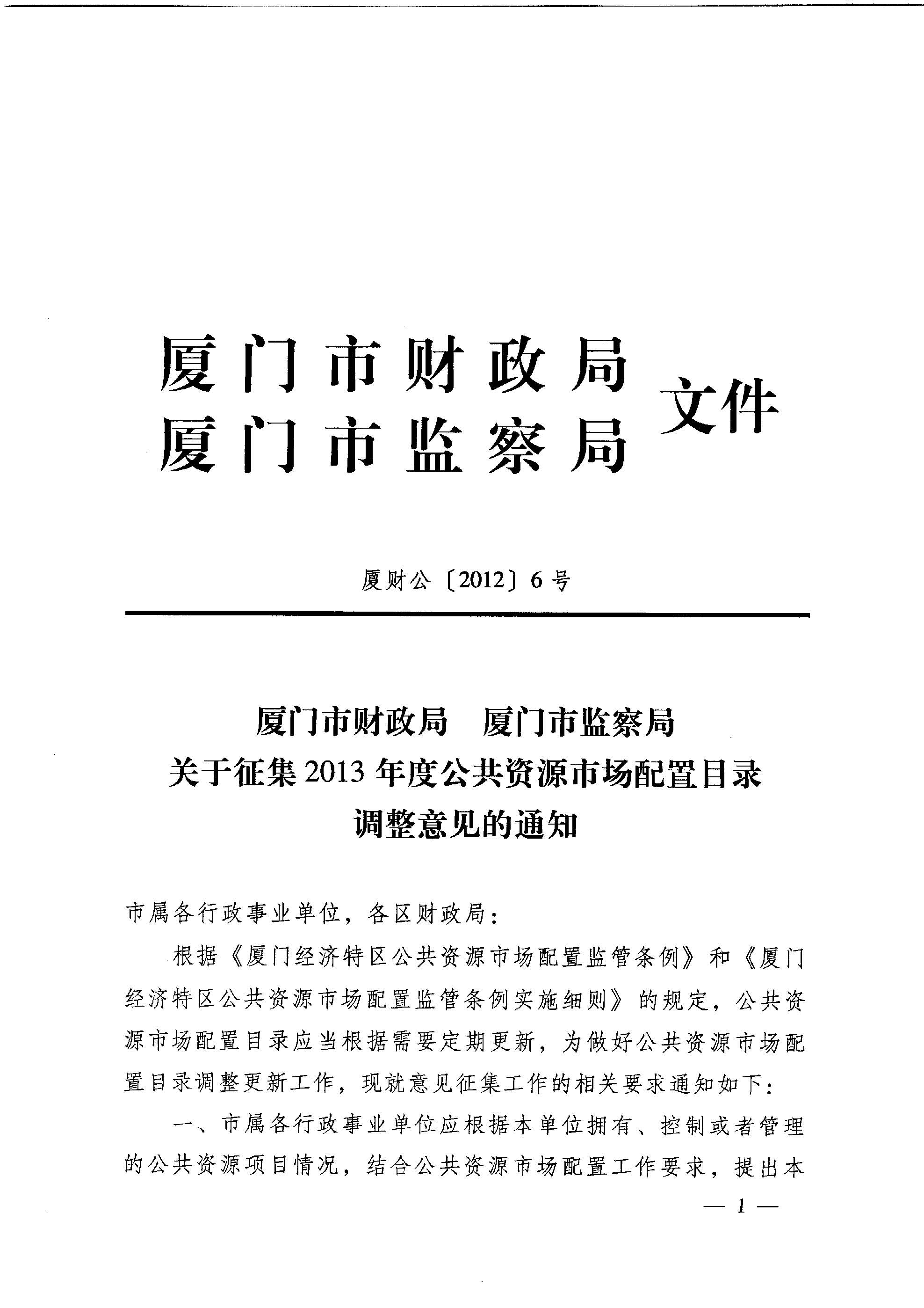厦财公【2012】6号下载 附件1下载:《公共资源项目调整申报表》 附件2下载:《厦门经济特区公共资源市场配置目录》