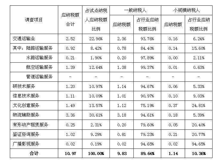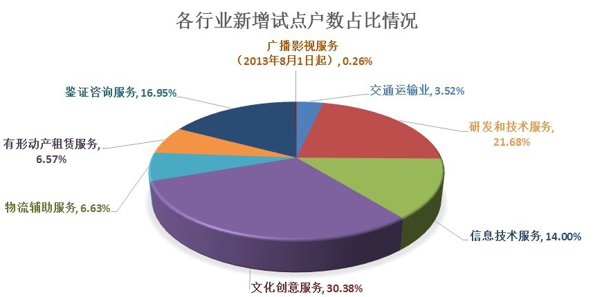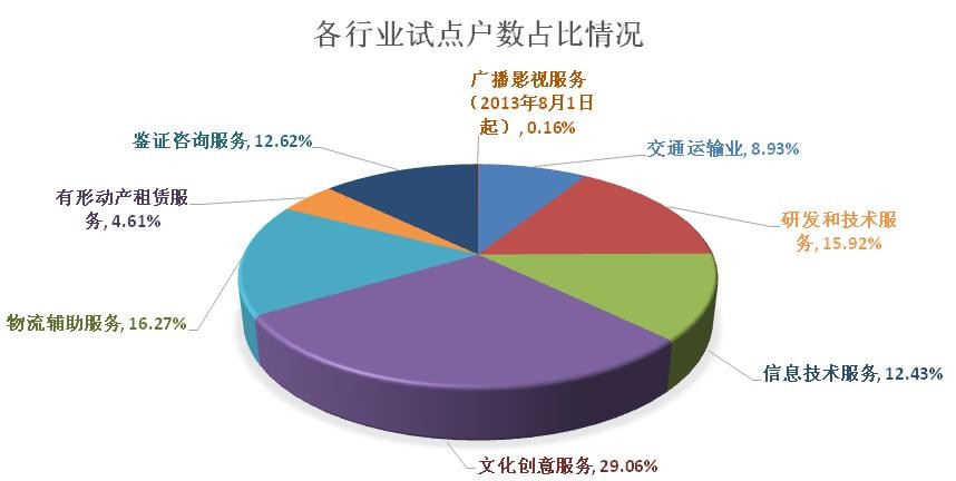 在1.74万户试点纳税人中,文化创意服务、物流辅助服务、研发和技术服务企业户数比例最高,分别为29.06%、16.27%、15.92%。