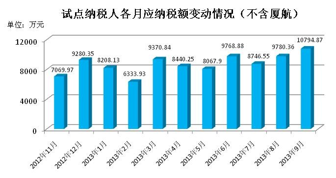 其中,厦门航空由于实行季度申报改征增值税,2013年3月申报纳税1.19亿元,2013年6月申报纳税1859万元,2013年9月申报纳税120.84万元。剔除厦航的影响,我市试点纳税人各月应纳税额除2013年2月为传统淡季外,其余各月整体较为平稳。具体情况如下: