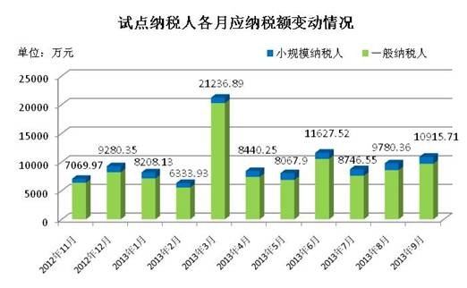 截至2013年10月22日申报期结束,纳入营改增试点范围的纳税人均已顺利完成纳税申报。试点以来,涉及试点服务的应纳增值税税款累计为10.97亿元。其中:一般纳税人为9.83亿元,占比89.64%;小规模纳税人为1.14亿元,占比10.36%。