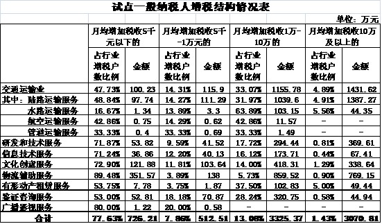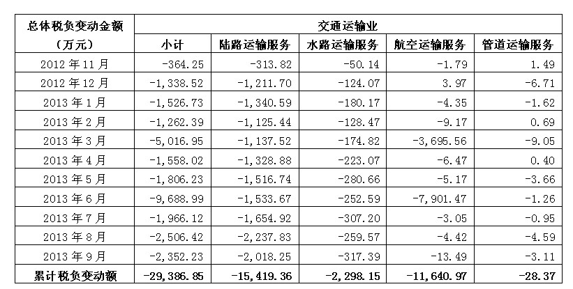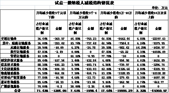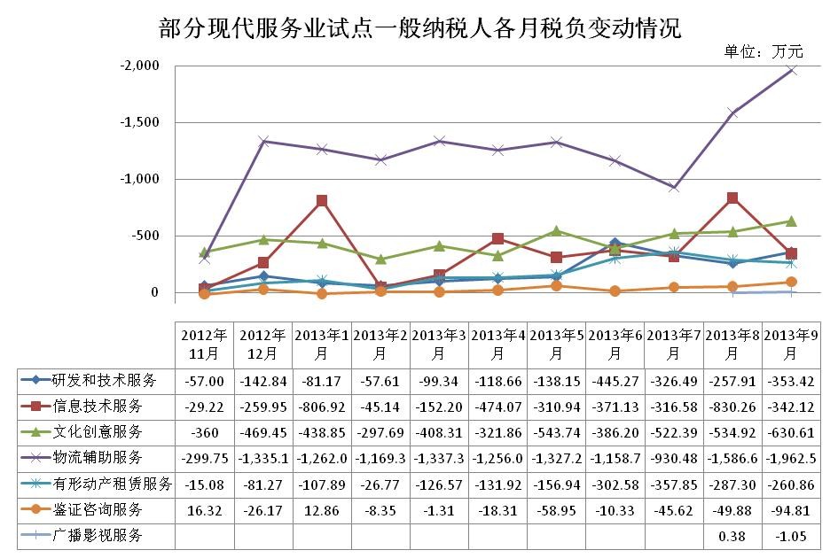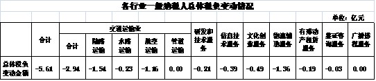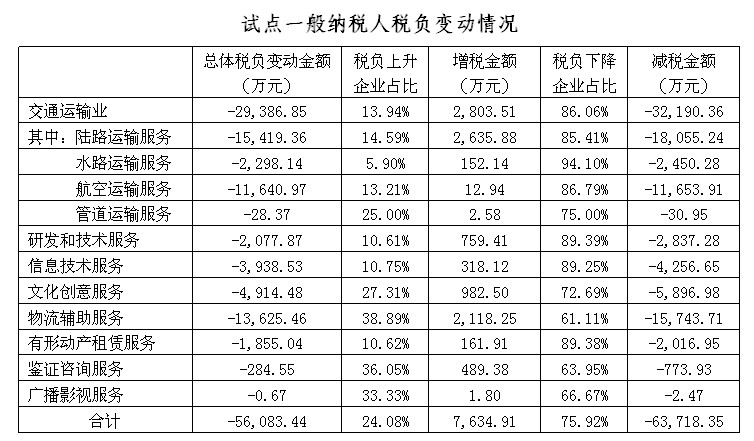 一般纳税人申报缴纳应税服务增值税累计为9.83亿元。剔除即征即退企业后,按增值税申报的应纳增值税税额减去按原营业税方法计算的营业税税额计算,整体减少税收5.61亿元。试点以来,各行业一般纳税人总体税负变动情况如下: