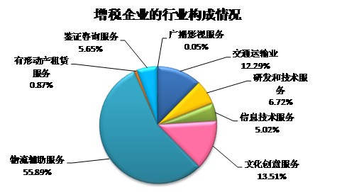 从增税企业户数占比情况来看,占比较高的主要是物流辅助服务、文化创意服务和交通运输业,具体如下: