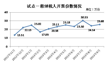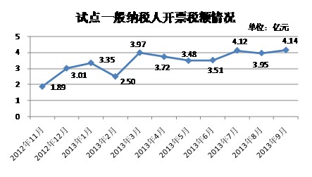 试点一般纳税人应税服务累计开具增值税专用发票250.29万张,开票税额37.65亿元。其中,开给我市试点纳税人126.93万份,开票税额11.7亿元;开给本市非试点纳税人(即原增值税纳税人)59.26万份,开票税额7.36亿元;开给外省市纳税人64.1万份,开票税额18.6亿元。试点一般纳税人开具增值税专用发票的份数和开票税额基本呈上升趋势。