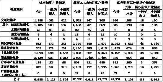 截至2013年9月底,我市共有1.74万户企业经确认后纳入营改增试点范围。其中:一般纳税人0.46万户,占26.58%;小规模纳税人1.28万户,占73.42%。试点以来共新增试点纳税人1.11万户,其中:有3245户企业属于在运行期间增加试点服务业务项目,或经税务机关多次政策宣传和培训申请纳入试点范围的;另有7146户为试点期间新办企业。