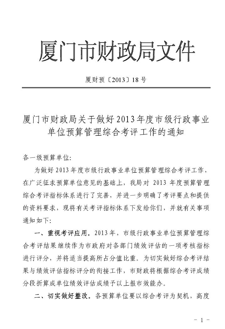 厦门市市级行政事业单位预算管理综合考评指标表(2013年度)
